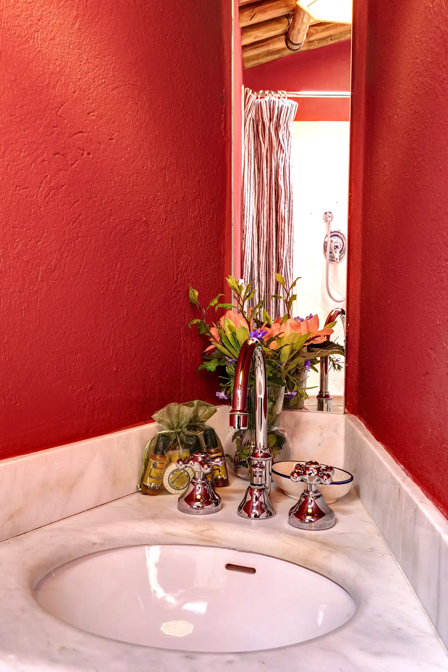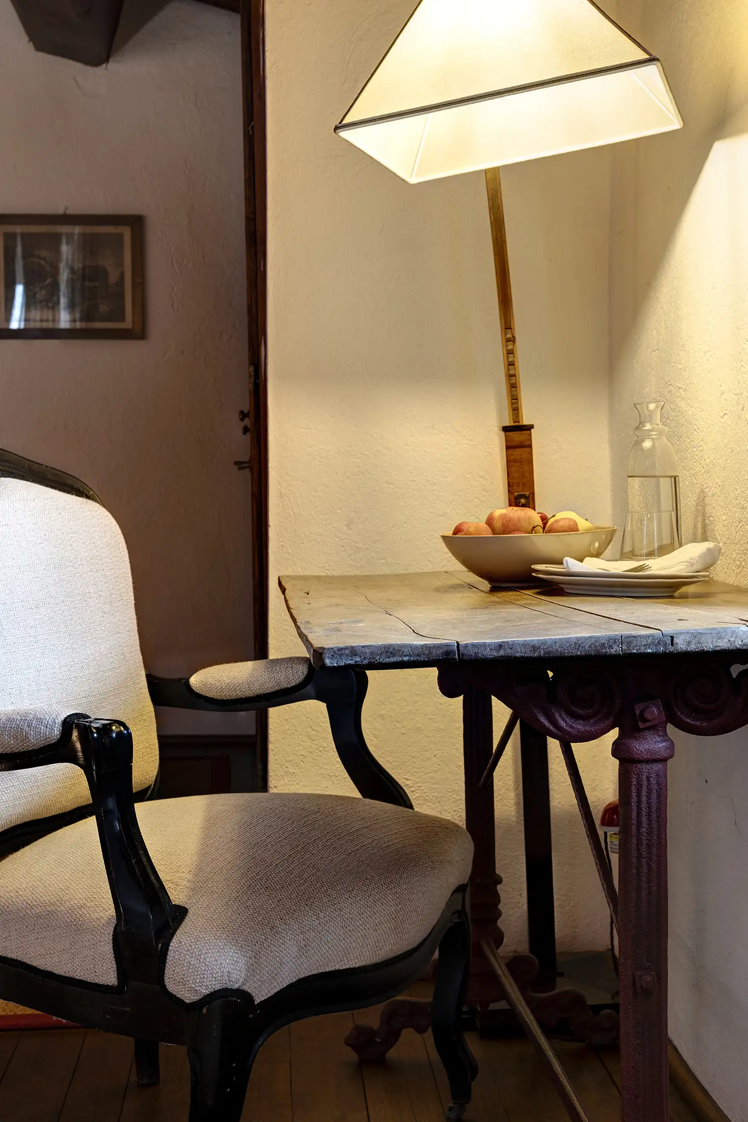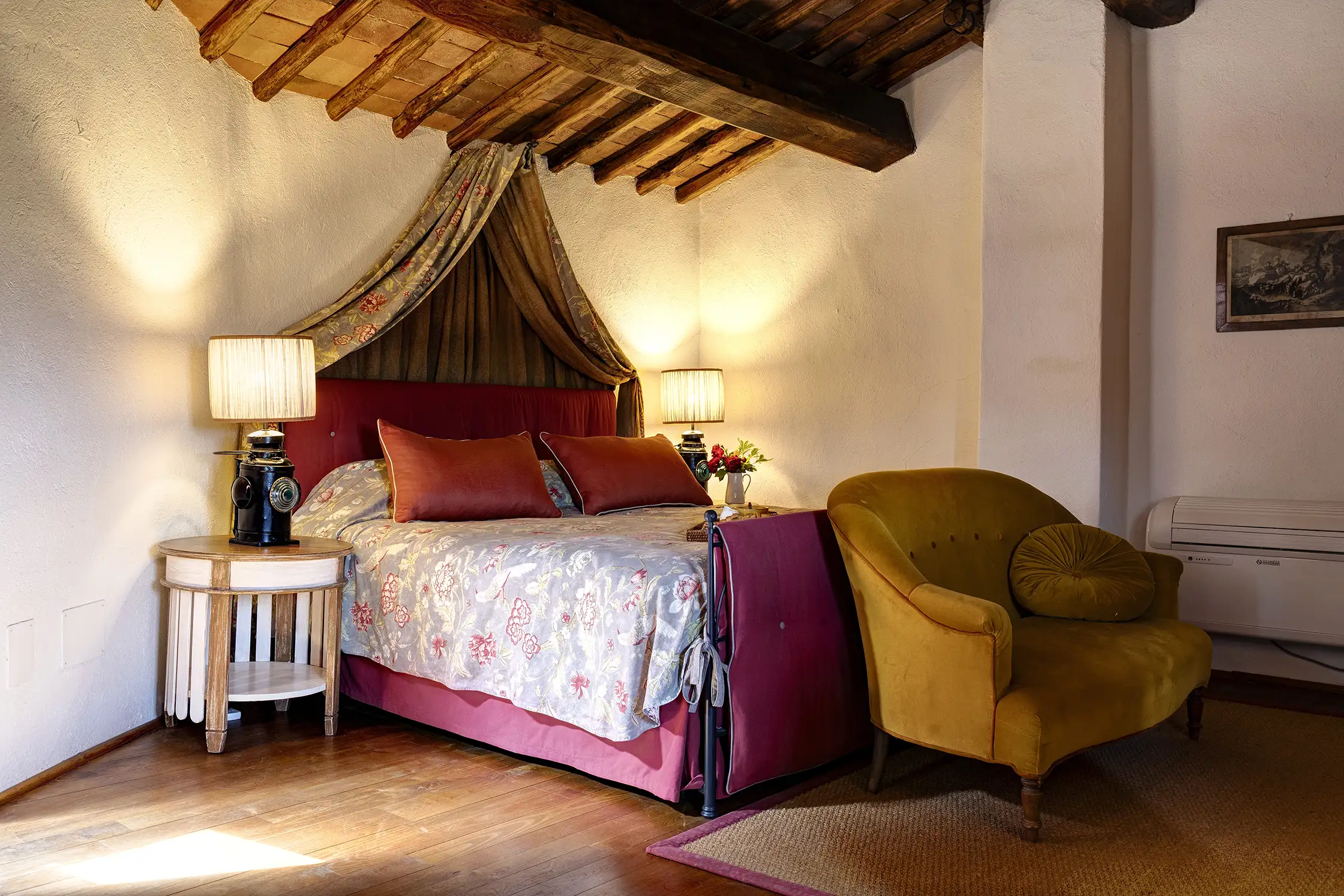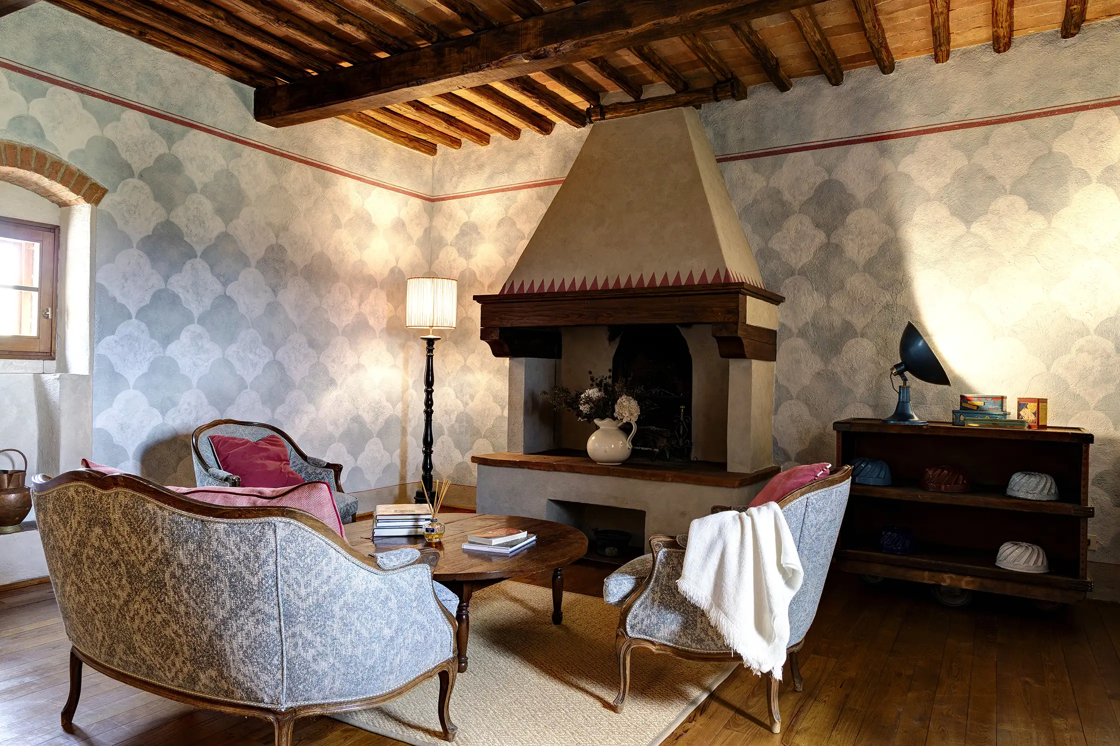 This suite takes the Italian name for a compass, and it comprises the top two floors of the medieval watch tower. This was the commanding view over the surrounding countryside that made Cà di Pesa so crucial as a defensive post in the Middle Ages. The large living room was hand painted, drawing inspiration from the extraordinary Palazzo Davanzati in Florence.