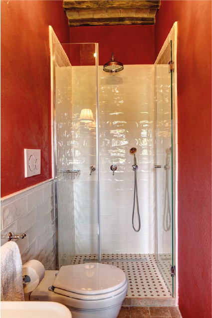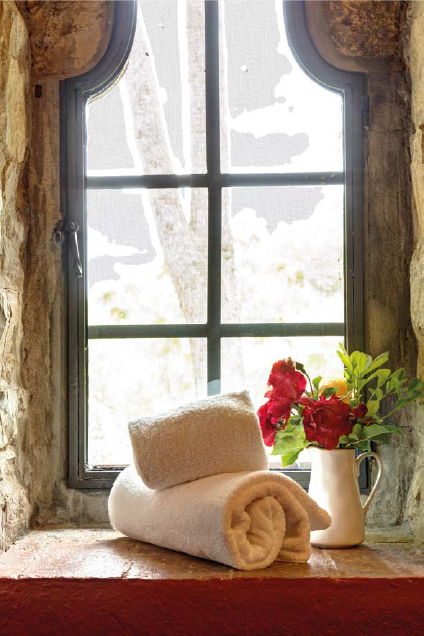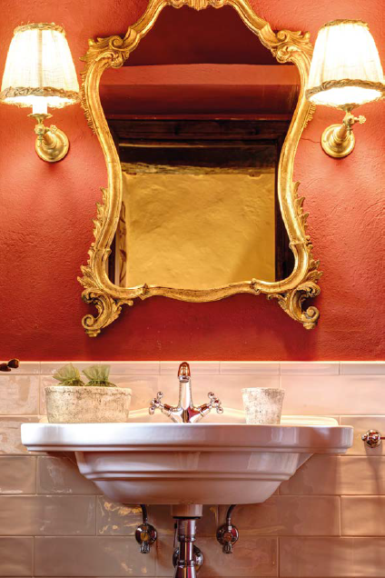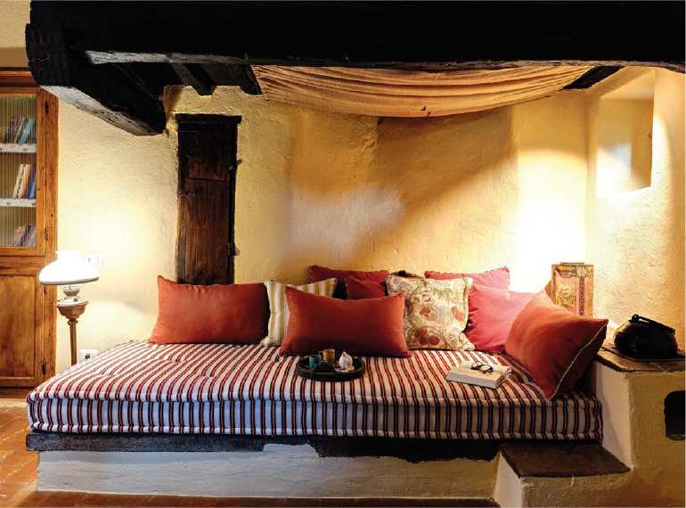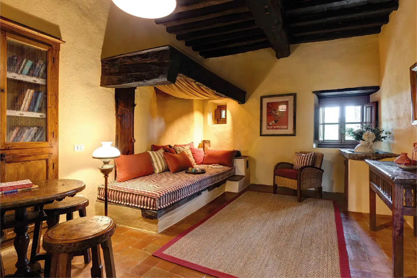 This is one of our most generously sized suites and possibly the one that most illustrates the medieval roots of the house. It is named for an olive press, still a fundamental part of Cà di Pesa’s way of life. The living room, with its vast daybed fashioned out of an old fireplace and its ancient stone sink, was once a kitchen. Now it has been combined with the adjacent rooms to make a luxurious space with a dramatic canopy bed, charming bathroom and rich array of artwork.