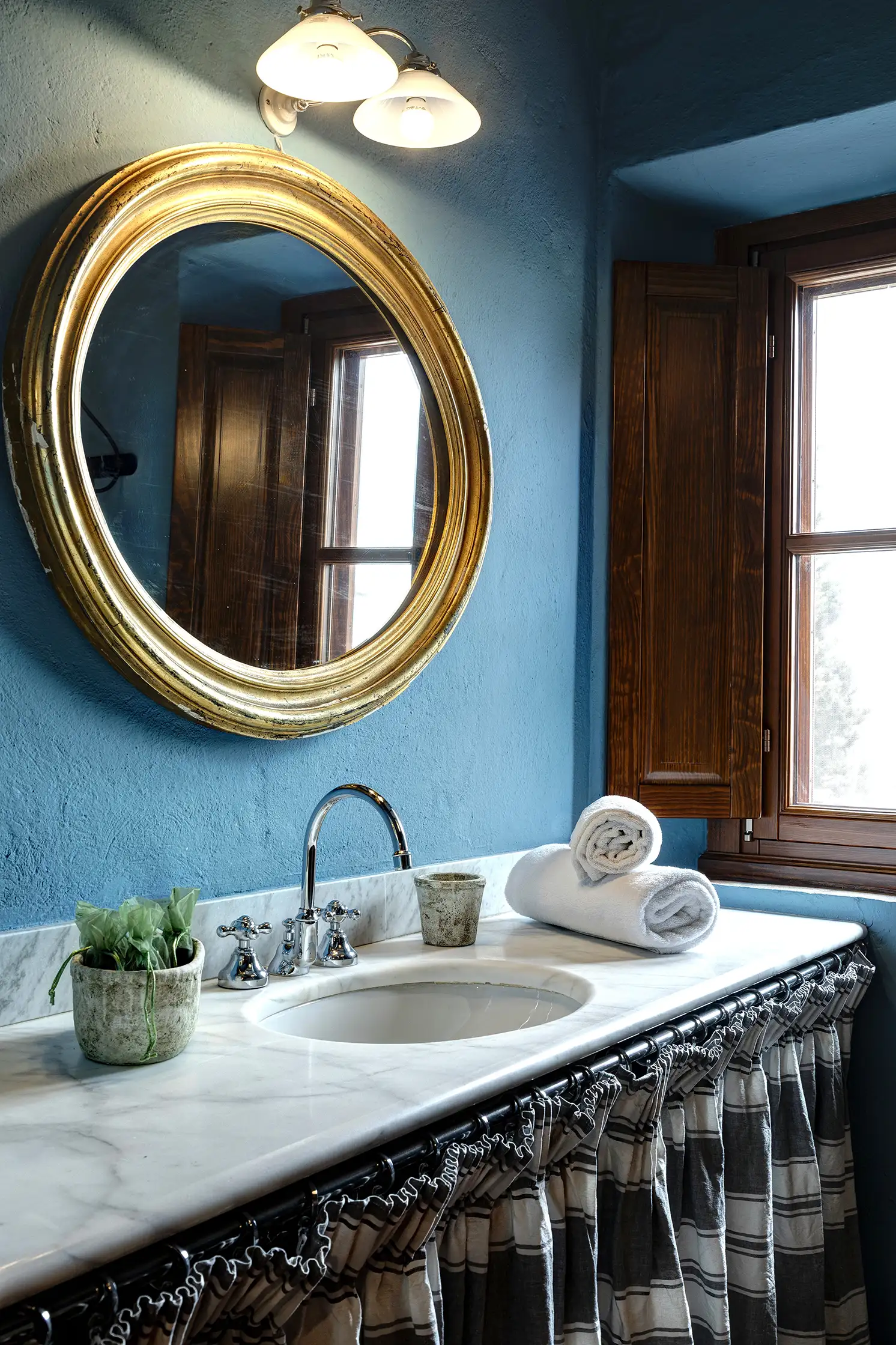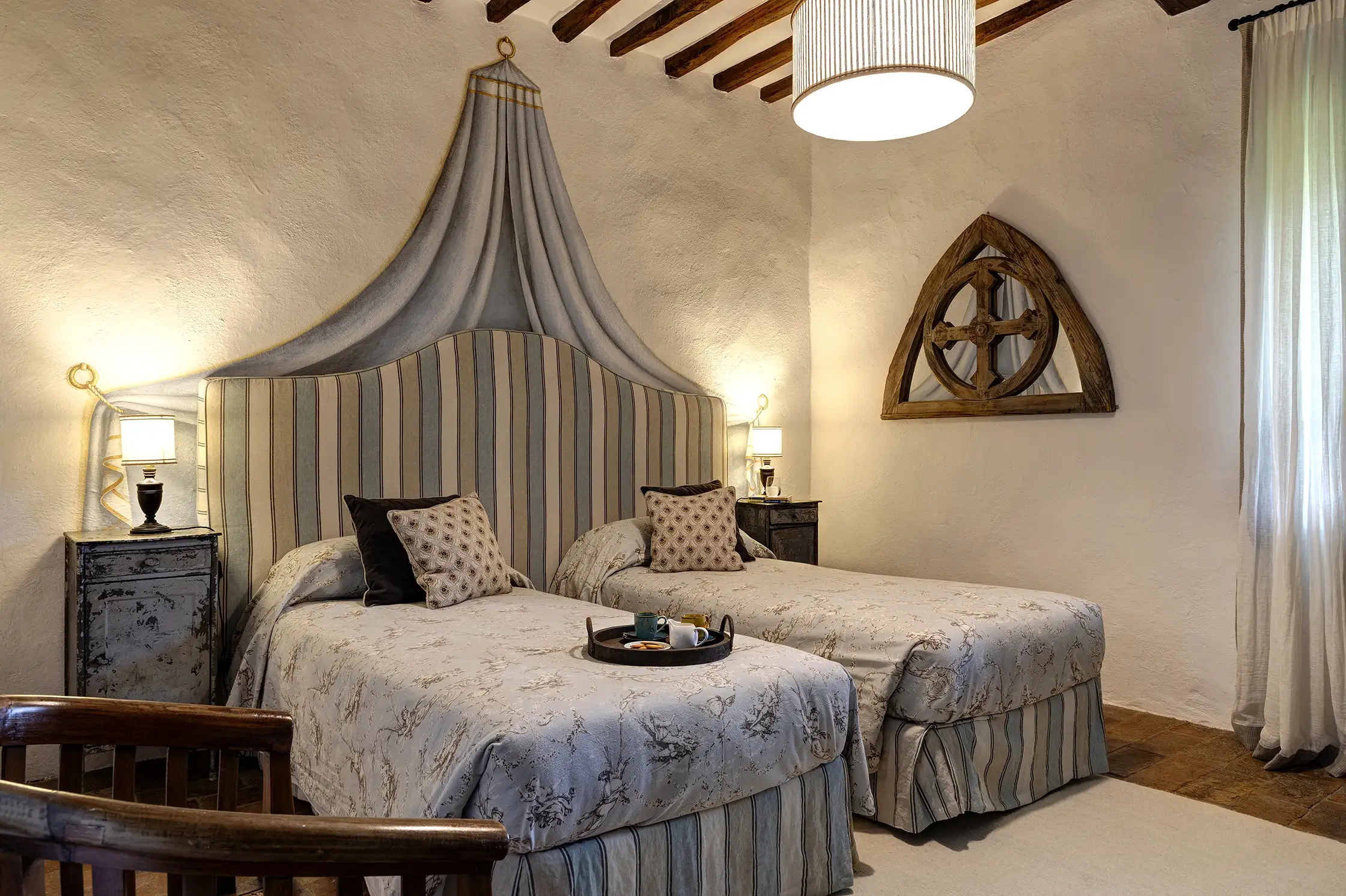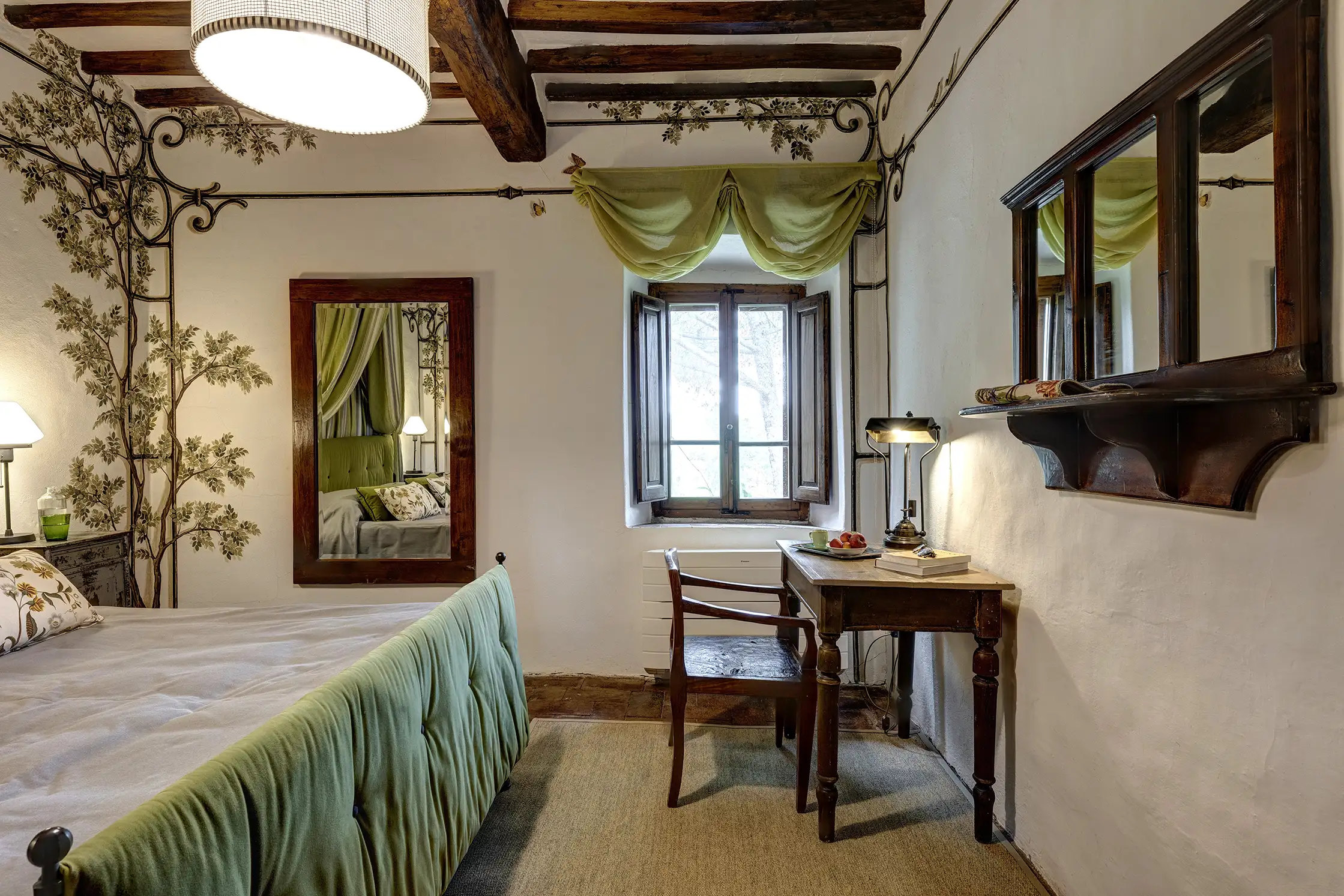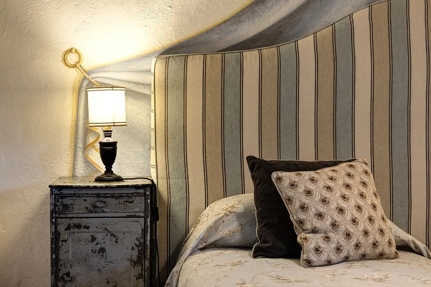 This couple of rooms are named for the sky and the Spring. Along the walls and corridors leading to the bedrooms you will discover collections of paintings of the four seasons discovered during many delightful trips to the famous antique fairs of Lucca, Arezzo and Santo Spirito in Florence. Primavera is a flutter with hand-painted butterflies and birds and trellises of spring flowers, whilst Cielo is a whimsical blue circus tent.