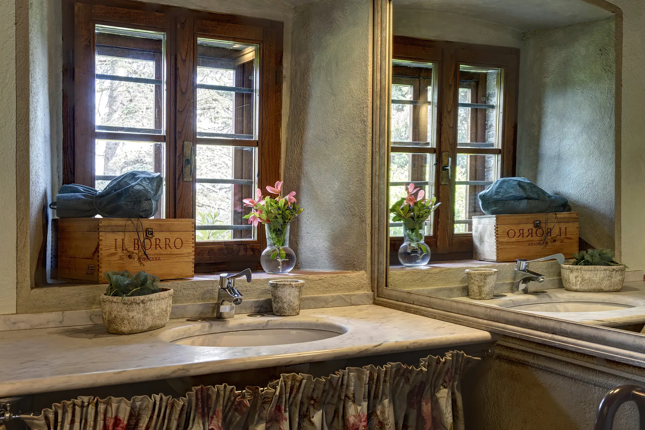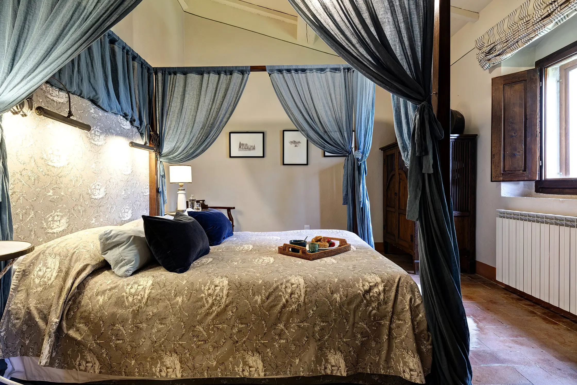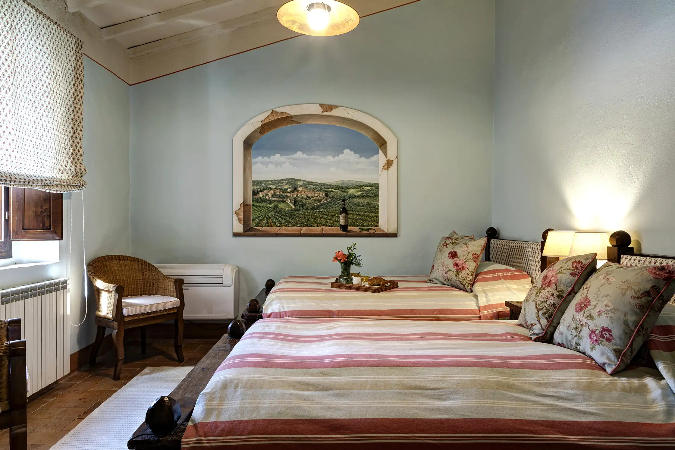 We were inspired once again by wine when naming this spacious suite. The Ricasoli family has existed for as long as Cà di Pesa, and the most notable, historical character created the recipe for Chianti. The suite sits in its own corner of the walled courtyard and has an independent entrance. It has a large bathroom on the ground floor, and then a curved staircase opens onto a living area on the 1st floor. From here you access the bedrooms. The first, a double with an exotic four poster bed and fascinating collection of antique luggage. Next door a comfortable twin room with its charming tromp d’oeil decoration featuring our own Chianti classico!
