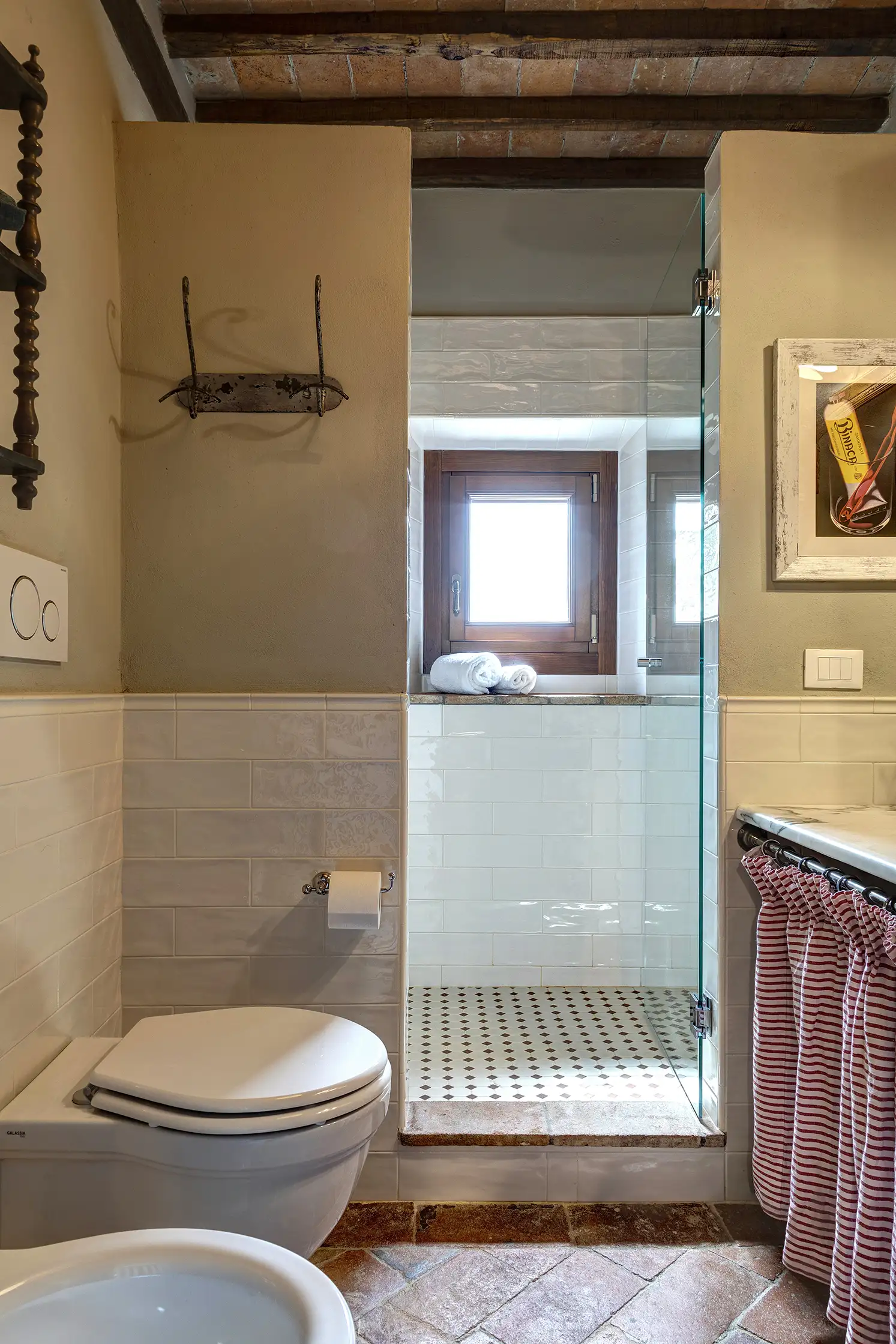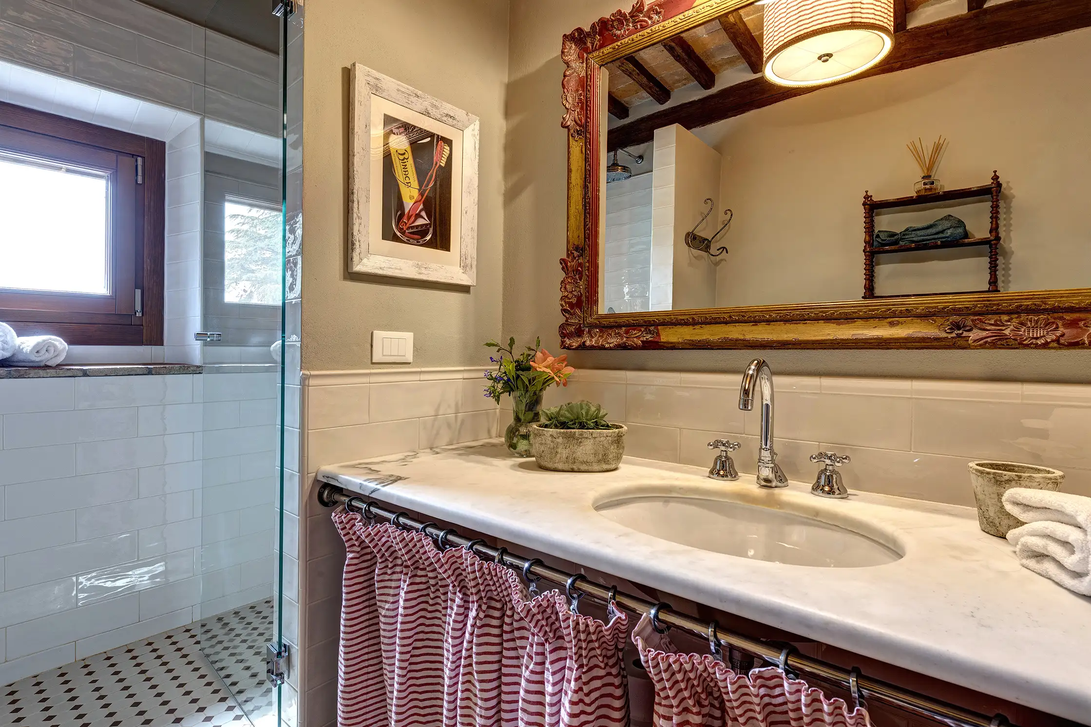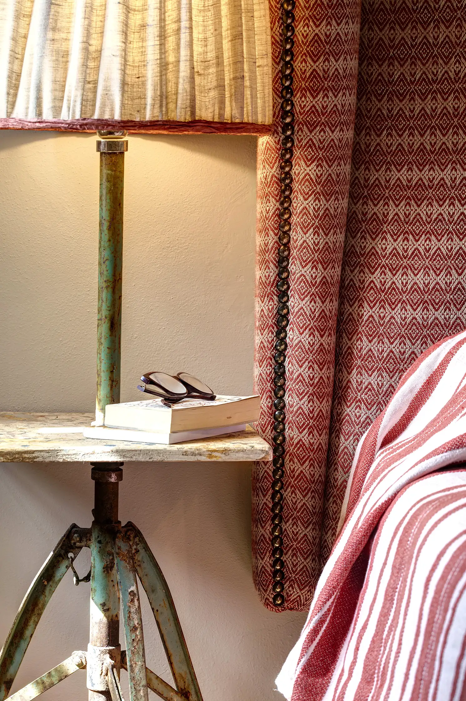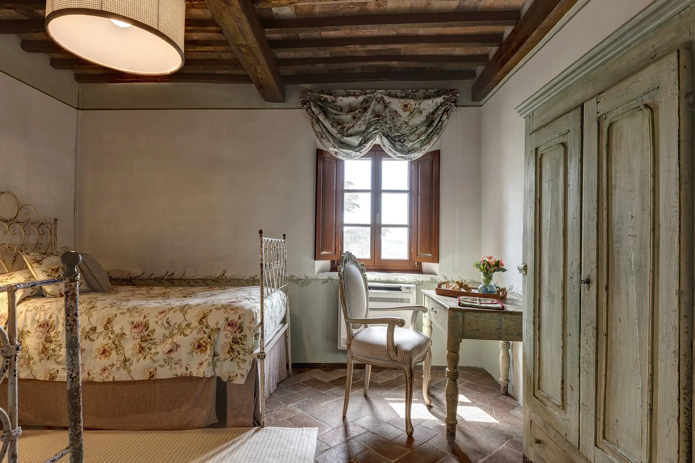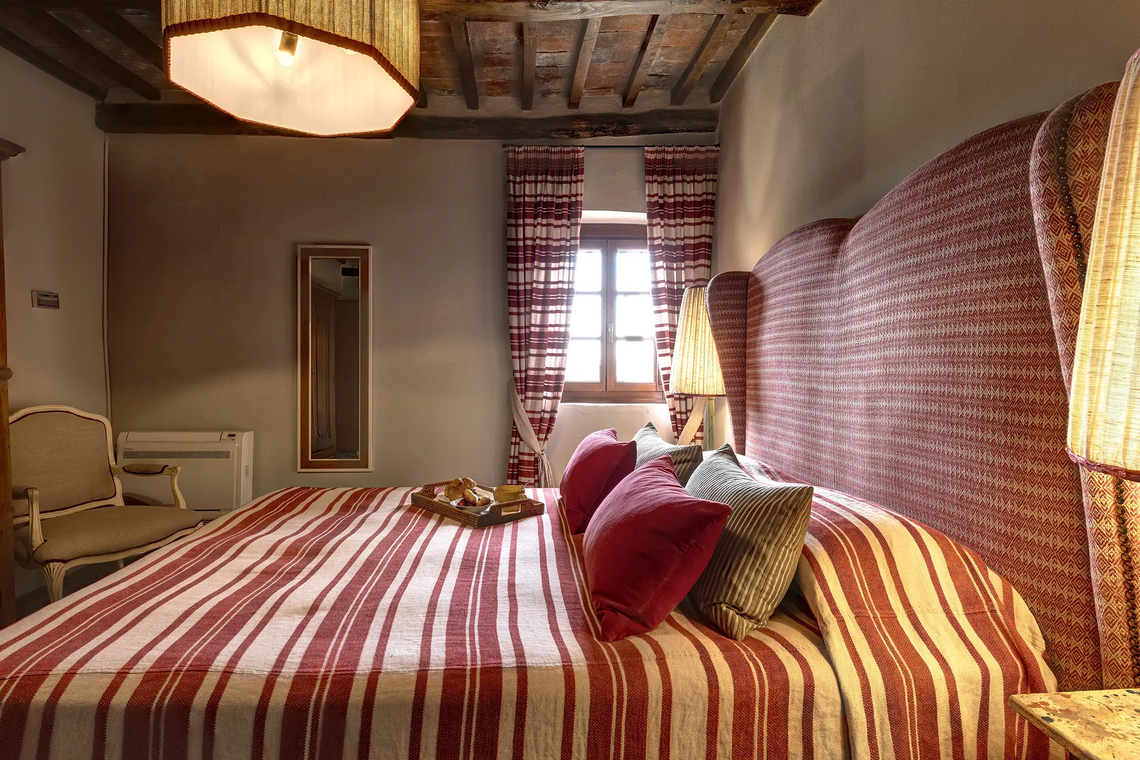 This charming family suite is tucked in off the first-floor landing. Tesoro, meaning treasure, named for its trompe d’oeil treasure chest hiding on a hand-painted wall behind one of the French, antique beds, shares a bathroom with Travaso. It just happens to have one of the most spectacular views in the house. The Travaso double room is imbued with red-coloured fabrics and warm toned wood which inspired the wine themed name, Travaso, which means to decant.